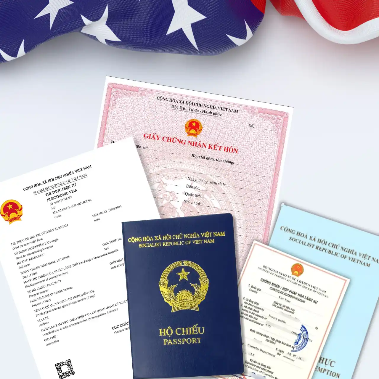 Hỗ trợ trọn gói các thủ tục pháp lý Việt Nam tại Mỹ như làm Passport/Visa Việt Nam, làm công hàm độc thân để kết hôn, hợp pháp hoá lãnh sự, giấy tờ hộ tịch, chứng thực chữ ký/giấy tờ,….
